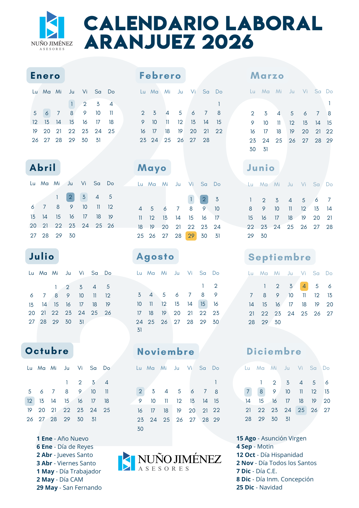 1 de enero (jueves) – Año Nuevo6 de enero (martes) – Epifanía del Señor2 de abril (jueves) – Jueves Santo3 de abril (viernes) – Viernes Santo1 de mayo (viernes) – Fiesta del Trabajo2 de mayo (sábado) – Fiesta de la Comunidad de Madrid29 de mayo (viernes) – San Fernando (festivo local)15 de agosto (sábado) – Asunción de la Virgen4 de septiembre (viernes) – Motín de Aranjuez (festivo local)12 de octubre (lunes) – Fiesta Nacional de España2 de noviembre (lunes) – Todos los Santos7 de diciembre (lunes) – Día de la Constitución8 de diciembre (martes) – Inmaculada Concepción25 de diciembre (viernes) – Navidad Asesoría laboral en AranjuezEn Nuño Jiménez Asesores ayudamos a empresas y autónomos a gestionar correctamente el calendario laboral, las jornadas, las nóminas y las vacaciones.